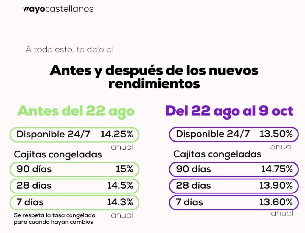 Ahora, como puedes ver las nuevas tasas en NU tienen “vigencia” en este caso del 22 de agosto al 9 de octubre, esto es porque casi siempre hacen cambios a los rendimientos que ofrecen, días después de que Banxico anuncia la nueva tasa de referencia, así que te recomiendo estar pendiente del próximo anuncio del Banco de México el 26 de septiembre del 2024.